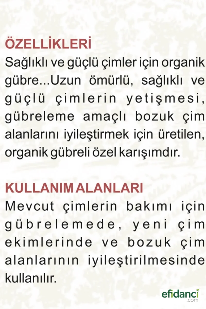 - Gür ve Canlı Çimler: Özel içeriği sayesinde çimlerinizin kökten uca güçlenmesini sağlar, daha yoğun ve canlı bir yeşilliğe kavuşmasına yardımcı olur.