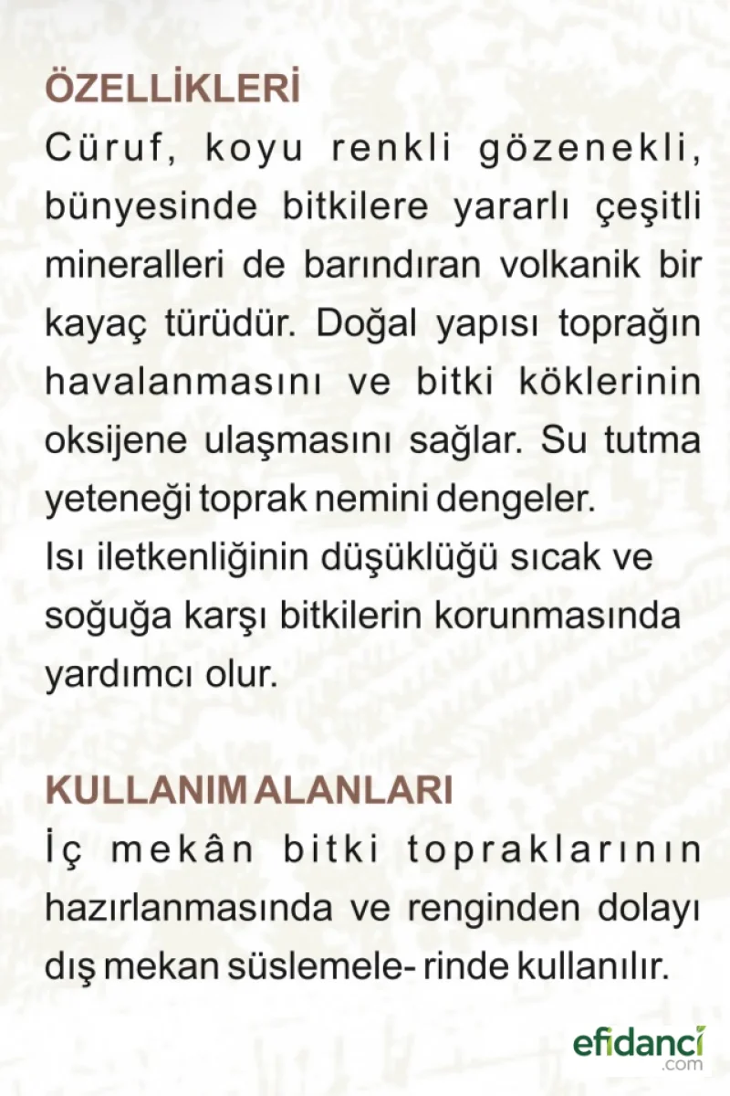 Doğanın binlerce yıllık eşsiz oluşumlarından biri olan Volkanik Tüf - Curuf, bitki yetiştiriciliğinde vazgeçilmez bir yardımcıdır. Gözenekli yapısı, hafifliği ve yüksek drenaj kapasitesi sayesinde bitkilerinizin kök gelişimini desteklerken, ideal bir büyüme ortamı sunar. Özellikle kaktüs, sukulent, bonsai gibi özel bakım gerektiren bitkilerinizden orkidelere, iç mekan bitkilerinizden dış mekan peyzaj uygulamalarınıza kadar geniş bir kullanım alanına sahiptir.